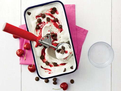 4. Scoop frozen yogurt mixture into bowls and top with dark chocolate chips and remaining sauce, as desired.