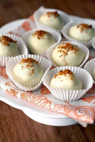 When you are ready to dip the truffles, melt the white chocolate or candy melts for coating in a heatproof bowl set over simmering water. Once completely melted and smooth, carefully dip one of the balls of filling into the chocolate. Turn quickly to coat and balance on the tines of a fork to shake off the excess. Transfer to a lined baking sheet and sprinkle with additional gingersnap crumbs, if desired. Repeat with the remaining filling balls. Transfer the baking sheet to the refrigerator and chill until the coating is set.