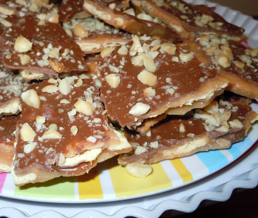Remove from oven. While hot, sprinkle with chocolate chips, let soften and melt, then spread. sprinkle with nuts. Let cool. Refrigerate until hardened. Break into pieces like peanut brittle.