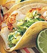 1.Preheat the oven to 225°. Place the fish in a medium bowl and drizzle with half of the lime juice. Cover and refrigerate for 15 minutes. 2.Using your hands, squeeze the juice and flesh from the tomatillos, 1 at a time, into a medium bowl; discard the skins. Mash the tomatillos with a fork. Add the zucchini, the remaining lime juice, the cilantro and 2 teaspoons of the salt and toss. 3.Spread the tortillas on 2 baking sheets and warm in the oven for about 10 minutes. 4.In a small bowl, combine the chili powder, cayenne pepper and 1/2 teaspoon of the salt. Remove the fish from the lime juice, pat dry and cover with the spice rub. Heat the olive oil in a large nonstick skillet over medium heat and cook the fish, about 4 minutes on each side. Break the fish into bite-size pieces and season to taste with salt. Arrange the fish in the tortillas with some of the salsa and avocado slices