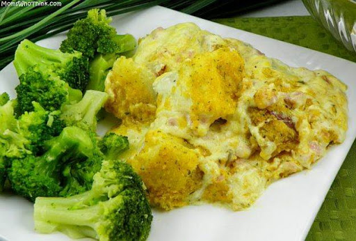 Mix sour cream, butter, cream of chicken soup, Cheddar cheese, green onions, ham, salt and pepper with the potatoes.