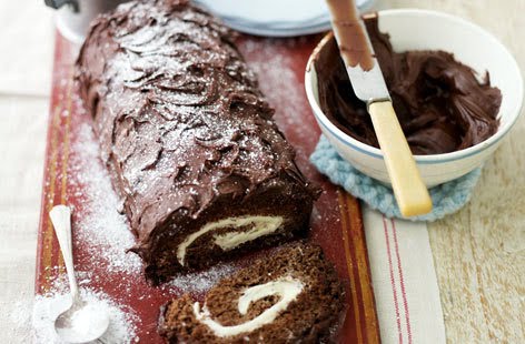 7. Spread the icing over the Yule log and dust with icing sugar. You can fill and top the cake with buttercream if you prefer (see cupcakes recipe). For the filling, use half the quantity of buttercream. For the topping, add 2 tsp cocoa powder, dissolved in a drop of boiling water, to the other half of the buttercream mixture.