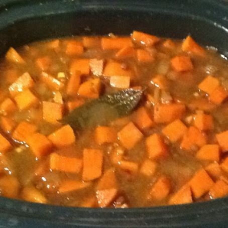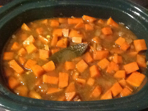 Heat extra virgin olive oil in a pan on the stove top over medium. Chop onion and add to oil. Cook over medium heat until translucent (about 3-4 minutes). Add chopped garlic and cook 1-2 minutes. Next, peel ginger root with a spoon, finely grate and add to the onions and garlic. Pour the reserved cup of vegetable broth to the pan, stir and remove from heat. Next, add curry, turmeric, crushed red pepper flakes, salt and pepper. Stir and combine with lentils and sweet potatoes in the slow cooker. Add bay leaves and cook on low for 8-10 hours.