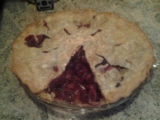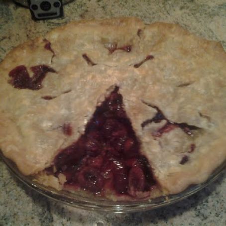 Pour cooled cherry mixture over pie filling. Top with dough, folding top dough over bottom, pressing together and fluting.