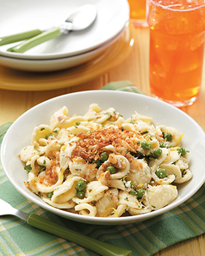 Toss pasta and pea mixture with sauce, then divide among four plates. Top each serving with bread crumbs.