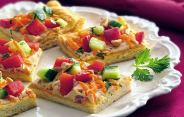* In small bowl, mix cream cheese spread, peanut butter, ginger and ground red pepper. Spread over cooled crust. Top with carrot, bell pepper, cucumber and peanuts. Serve immediately, or cover and refrigerate up to 2 hours before serving.