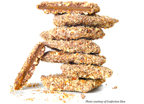Sprinkle immediately with chocolate morsels, and spread evenly to ½ inch from sides. Sprinkle with ground walnuts, and let stand until firm. Break into small pieces, and store in an airtight container.