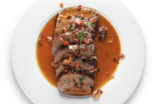 2. Heat oven to 325°. Add remaining onions to pot; cook, stirring, until caramelized, about 18 minutes. Return beef to pot with reserved marinade and sachet; boil. Cover; bake until beef is very tender, about 2½ hours. Transfer beef to a platter; pour sauce through a fine strainer into a bowl.