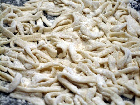 Make hollow in 2 cups flour. Put eggs in. Add salt. Stir until well mixed if not rollable add flour until it rolls easy. If too dry add a little oil or water. Let dry and cut.