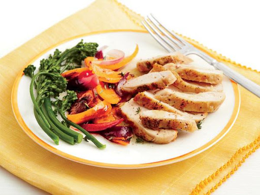 5. Toss pepper mixture with 2 to 3 Tbsp sherry or red wine vinegar and 1 tsp chopped fresh thyme. Serve with chicken and cooked broccolini.