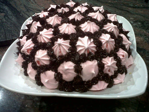 An elegant domed Sponge cake, layered with pastry cream, topped with ganache and meringue cookies and piped ganache. I've made the meringue cookies in pink but they can be left white.