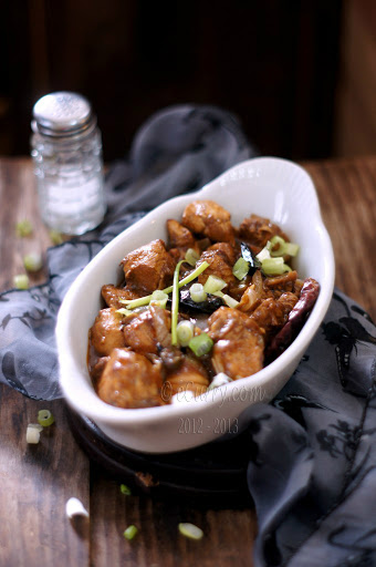 Heat oil in a pan/wok. Add the cornstarch/corn flour to the marinated chicken and toss for the flour to coat the chicken pieces. Shallow fry the chicken (in a single layer) at high- medium heat for about 6-8 minutes or until the chicken is cooked through and the outside is golden brown. Remove with a slotted spoon and transfer on paper towels. Set aside.