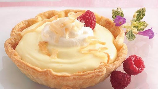 Reserve 2 tablespoons toasted coconut for topping. Sprinkle each crust round with about 1 tablespoon of the remaining coconut and 1/4 teaspoon sugar; roll in lightly with rolling pin. Press each round, coconut side up, in bottom and up side of tart pan. Prick bottoms and sides with fork. Place pans on large cookie sheet.
