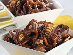 Coat baking pan with non-stick cooking spray. Combine cereal squares, pretzels, peanuts and toffee in large bowl.