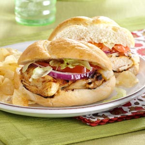 Drain; discard marinade. Grill, uncovered, over medium-low heat, turning occasionally, for 10-12 minutes or until juices run clear. If desired, top each chicken breast with a slice of cheese and grill 1-2 minutes longer or until cheese begins to melt. Serve on rolls with tomato, onion and lettuce. Yield: 6 servings.