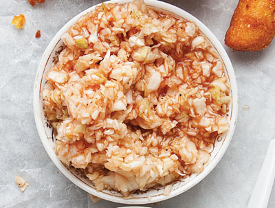 In Lexington, North Carolina, coleslaw is made with a spicy ketchup-based dressing. It is absolutely delicious and I love to make it for barbeques or summer parties!