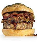 4. Preheat the broiler. In a large skillet, melt 1 tablespoon butter over medium heat. Add the patties and cook, turning once, for 12 minutes.5. Meanwhile, spread the remaining 2 tablespoons butter on the rolls and broil until golden. Place a patty on each roll bottom; top with onions, wine sauce, bacon and a roll top.