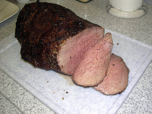 Combine wine and butter in a large heavy-duty zip-top plastic bag, add roast. Seal and chill at least 8 hours or up to 24 hours, turning occasionally. Remove roast from marinade; discarding marinade. Place roast in a 13 x 9 inch pan lined with heavy duty aluminum foil. Combine salt and pepper, and rub over surface of roast. Bake uncovered at 500 for 20 to 30 minutes. Turn oven off. Do not open door for 2 hours. Meat thermometer should register 145-medium rare, or 160 medium. Thinly slice meat, reserving pan juice. Serve meat with pan juices and horseradish sauce.