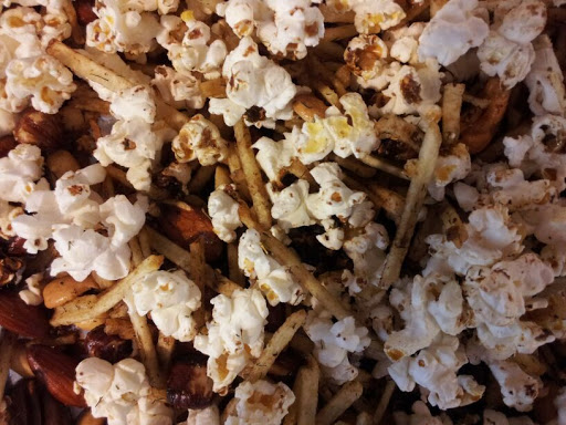 Pop popcorn. Combine popcorn with nuts and potatoes. Mix butter with seasonings. Pour over popcorn mixture and toss well. Spread onto jellyroll pan. Bake at 325 degrees F for 10 minutes, stirring once. Let stand until cool. Store in airtight containers.