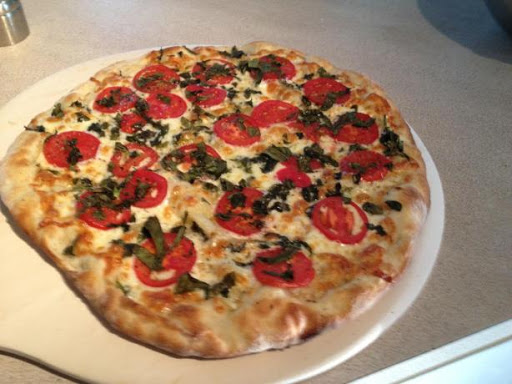• 1 Roma tomato, cut crosswise into 1/8 - 1/4-inch-thick slices or equal amount of thinly sliced cherry tomatoes (slice thinly and lay between paper towels for an hour or two before assembling pizza)