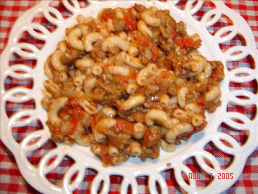 I've been making a one dish meal similar to this for years. It too, was my mom's go to supper for us girls when we were children. We called it goulash, but whatever you call it, it makes a wonderful meal. I made this exactly as written with the exception of using regular cheap tomato juice in place of the water, I've found that this one addition makes a big difference in the flavor. Which means DH doesn't feel compelled to pour ketchup all over his, (that used to irritate me). This is also an easy recipe to dress up any way you want, ie. italian seasonings, mushrooms, peppers, hot pepper flakes etc. This is really good, and leftovers are better!