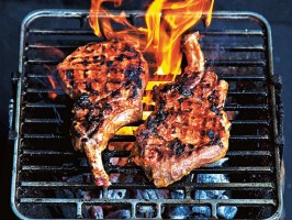Preheat a grill to a two-zone fire (medium and hot). Grill the pork chops for about 10 minutes this way: Start on hot heat for about 1 minute, then shift the chops to medium heat. After about 4 minutes, flip the chops and repeat the two-zone grilling on the other side. When the pork is ready, it'll be glossy and juicy on the outside. Test for doneness using "The 'Nick-and-Peek' Method". Let the pork chops rest for about 2 minutes and serve.