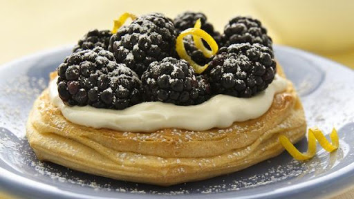 In same small bowl, beat cream cheese with electric mixer on medium speed until smooth. Beat in powdered sugar, whipping cream and lemon peel. Spread half over top of each round; top with blackberries.