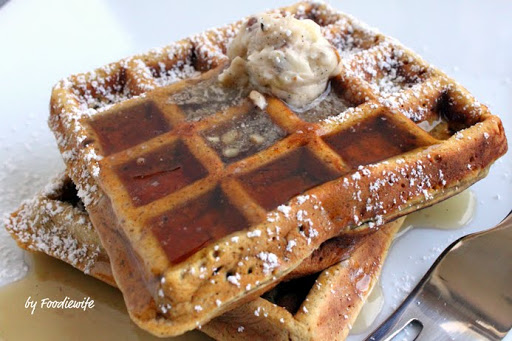 Stir the wet into dry until just moist. Do not overstir the waffle batter. Brush the iron with a little-melted butter and cook 4 waffles, 4 sections each. Serve with toppings of choice.
