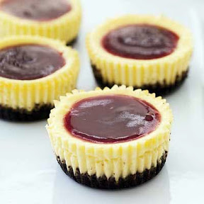 1.Preheat the oven to 350 degrees. Line a standard 12-cup muffin pan with foil baking cups and spray the cups with vegetable oil spray. In a food processor, crush the chocolate wafer cookies. Add the butter and process until fine crumbs form. Spoon the chocolate cookie crumbs into the prepared baking cups and press with the bottom of a glass to compact. Bake for 5 minutes, or until almost set. Leave the oven on. 2.Meanwhile, in a medium bowl, beat the cream cheese and sugar at medium speed until smooth. Beat in the fromage blanc, then add the eggs and vanilla and beat until smooth. 3.Pour the cheesecake batter into the baking cups, filling them three-quarters full. 4.Bake the cheesecakes for 15 minutes, or until slightly jiggly in the center. Remove from the oven and spread 1 teaspoon of the warmed raspberry preserves on top of each cheesecake. Transfer the muffin tin to the freezer and chill the cheesecakes until set, about 15 minutes. 5.Remove the cheesecakes from the pan and peel off the foil baking cups. Transfer the cheesecakes to a platter and serve. The mini black-bottom cheesecakes can be refrigerated for up to 4 days. --------------------------------------------------------------------------------