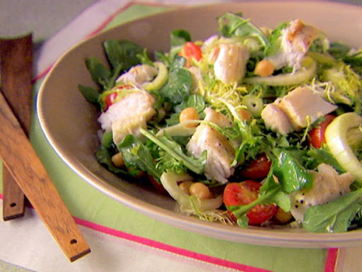 For the SALAD: In a large bowl, combine the frisee, arugula, tomatoes, chickpeas, and fennel. In a small bowl mix together the olive oil, lemon juice, honey, cumin, salt, and pepper. Drizzle the olive oil mixture over the salad and toss to combine. Top with fish and serve.