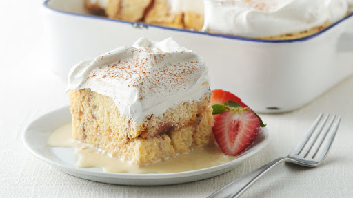 In medium bowl, mix condensed milk, evaporated milk and whole milk until combined. Pour half of the mixture evenly over cinnamon roll layer. Using end of wooden spoon, poke holes in cinnamon rolls.