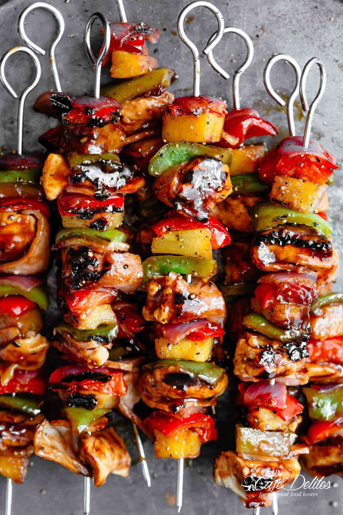 Build skewers by alternating chicken, pineapple, peppers, and red onion. Place on a baking sheet and pour over half your marinade.