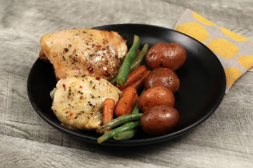 Place 4 thighs in bottom of 6-quart slow cooker and pour over half of the sauce.