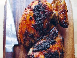 Preheat a grill to medium. Grill the chicken, covered, for about 35 minutes. Start by grilling skin side down for about 2 minutes. Flip the chicken and brush on the reserved marinade. Flip the chicken about every 7 minutes, brushing on more marinade after each turn. The chickens are done when very juicy with meat pulling away from the bone. Rest the chicken for 5 minutes, cut into serving pieces, and serve.