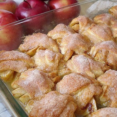 •Preheat the oven to 425 degrees. Unroll pie crust according to package directions. Cut into fourths. Place apples evenly in center of each fourth. Pull corners over apples, pinching to seal. Place on a baking sheet; brush evenly with egg white, and sprinkle with sugar.