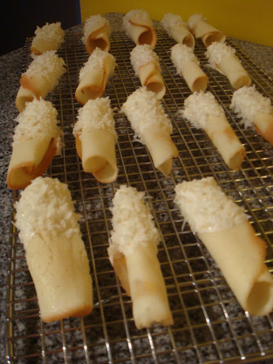 6. Microwave frosting for about 15 seconds to soften to a consistency just thicker than honey. Dip the ends of the pirouettes into glaze, then sprinkle with coconut. Place on a cooling rack over a baking sheet to catch drips for 1 to 2 hours.
