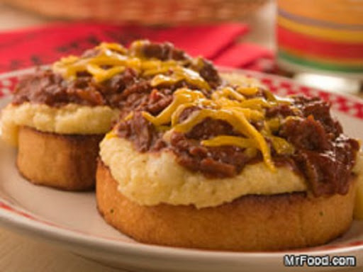 Spoon equal amounts of cheesy grits over warm toast, top with BBQ beef, and sprinkle with the remaining Cheddar cheese; serve immediately.