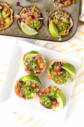There is something about shrinking food that makes it all the more enticing. These Muffin Tin Mexican Bowls are no different! Tortilla-lined muffin tins are filled with chicken, refried beans, salsa and cheese; then topped with lettuce, tomatoes, jalapeno slices and a squeeze of lime. Perfect for a main dish (2-3 per person) or an appetizer buffet. Gluten flour tortillas may be substituted.