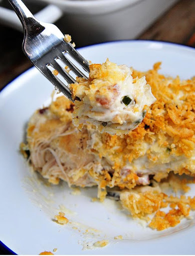 For the topping, mix together crushed crackers, cheese, and melted butter. Sprinkle on top of jalapeno popper topped chicken. Bake until crackers are lightly browned, about 15 minutes.