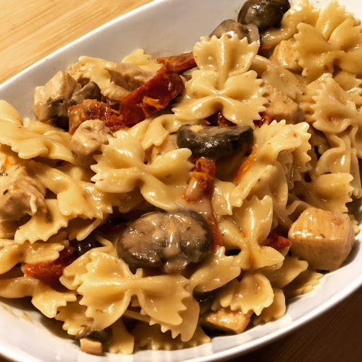Stir in the sun-dried tomatoes, heavy cream and parmesan. Let sit for about 5 minutes, stirring occasionally and it will thicken up into an incredible sauce, coating all the pasta perfectly