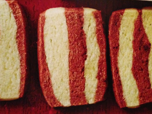 4. Preheat oven to 350°F. Remove dough from pan, remove and discard plastic wrap. Place on cutting board. Using a sharp knife, cut dough crosswise into 1/4-inch slices. Cut each slice in half crosswise. Place slices 2 inches apart on an ungreased cookie sheet. Bake about 8 minutes or until edges are set. Transfer to a wire rack and let cool. Makes 64 slices.