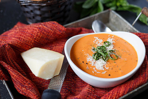 Pour all of the strained and pureed tomato mixture back into the saucepan, and then add the remaining ingredients. Bring the soup back up to a bubble then reduce heat and simmer for 20 minutes. Before serving remove rind. May need to thin with additional chicken broth. Serve approximately one cup of soup with a garnish of 3 or 4 croutons on top and a sprinkling of shredded Parmesan cheese.