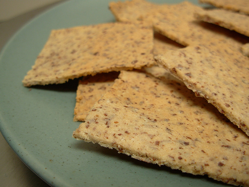 Combine first three ingredients and slowly add in water until dough sticks together but isnt too moist. Form into a big patty and place on a piece of parchment paper. Place another piece of parchment on top and using a rolling pin roll dough flat to cracker height. Remove top layer of parchment and place bottom parchment (with dough) on a baking sheet. Score dough with a knife or pizza cutter to make cracker shapes. Place in 350F degree oven for 25-30 minutes or until golden brown.