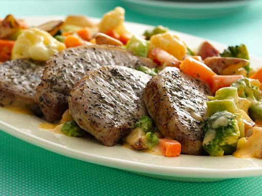 3 Bake 25 to 35 minutes, stirring vegetables halfway through bake time, or until pork is no longer pink and meat thermometer inserted in center reads 160°F and vegetables are tender. Serve hot.