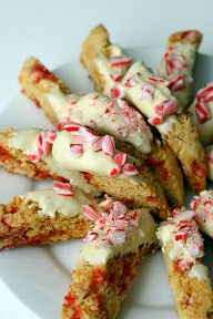 Preheat the oven to 350° F. Line a baking sheet with parchment paper or a silicon baking mat. In a medium mixing bowl, combine the flour, baking powder and salt; stir briefly with a fork to combine. In the bowl of a stand mixer fitted with the paddle attachment, beat together the butter and sugar on medium-high speed until well combined, about 2 minutes. Beat in the eggs one a time, mixing well after each addition. Add in the dry ingredients and mix on low speed just until incorporated. Fold in the 2/3 cup crushed peppermints with a rubber spatula until evenly incorporated. Evenly divide the dough into 4 portions. Form each into a 9″ by 1½” log on the prepared baking sheet, spaced evenly. Bake until the cookies are light golden brown on top, about 18-20 minutes. Remove the pan from the oven and let cool for 10 minutes on the cookie sheet. Reduce the oven temperature to 325° F. After the logs have cooled for 10 minutes, use a sharp serrated knife to cut the logs into ½-inch slices on the diagonal. Arrange the cut pieces on the baking sheet, laying on one of their cut sides so one cut side is facing up. Bake for 15 minutes more, until the cookies are light golden brown and crisp. (They may seem a bit soft, but will firm as they cool.) Transfer to a cooling rack to cool completely. Once the biscotti have cooled, melt the white chocolate in the top of a double boiler. Dip one half of each cookie in the chocolate, shake gently to remove the excess, and transfer to a baking sheet or work surface lined with wax paper. Sprinkle with extra crushed candy canes while the chocolate is still wet. Let stand at room temperature until the chocolate has set completely. Store in an airtight container.