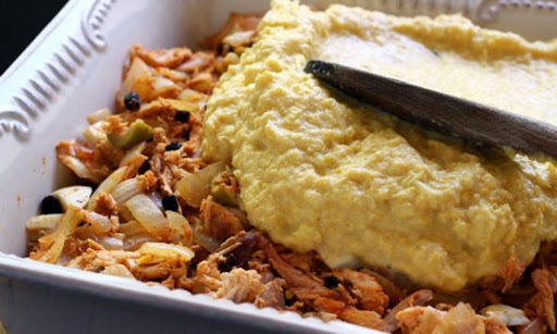 Place corn kernels in a blender jar. Add milk and purée. Spread over chicken mixture. Sprinkle top with sugar.