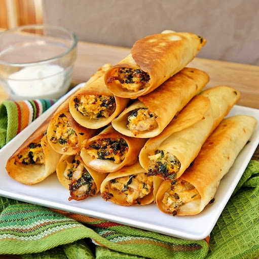 2. Working with one tortilla at a time, add 2 tablespoons of the chicken mixture down the center of each tortilla. Roll up and set seam side down on a plate. Repeat until all the tortillas are filled and rolled.
