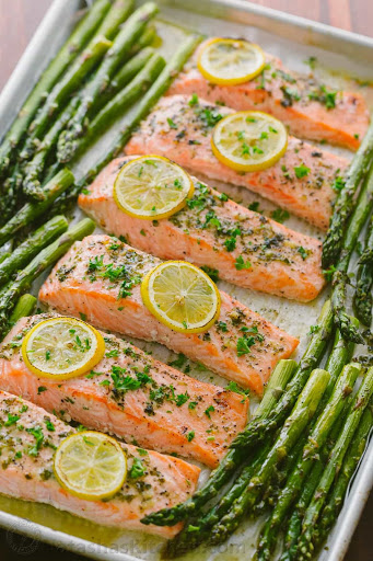 Place salmon fillets in a row down the center of your lined baking pan. Arrange trimmed asparagus on the sides of the salmon. Drizzle asparagus lightly with olive oil and roll to coat. Sprinkle both asparagus and salmon with salt and pepper.