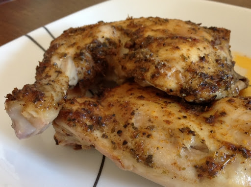 Excellent seasonings! I enjoyed the rich flavor of the seasonings in this dish. I ran out of oregano, so I used sage for the rest. My chili powder was a bit spicy, so I skipped the pepper. I also used six cloves of garlic for 5 leg quarters. Since I'm avoiding fat, I removed the skin and fat from the leg quarters before baking. I sliced a couple onions into rings and put the chicken on those, then patted the seasonings on top. I used all white wine since I was out of chicken broth and baked it covered at 350 for 1 1/4 hours, turning once. Lower temp, covered, keeps skinned chicken from drying out. I removed the chicken to a warm platter, added a cornstarch slurry to the pan juices to thicken them slightly, then served them with fresh sweet corn and a spinach salad. Tender, juicy, flavorful -- wonderful!"