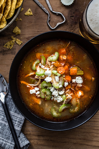 Remove chicken and shred with a fork. Stir shredded chicken back into the soup and adjust seasoning with salt and pepper to taste. Ladel soup into bowls and top with sliced celery and blue cheese and serve.